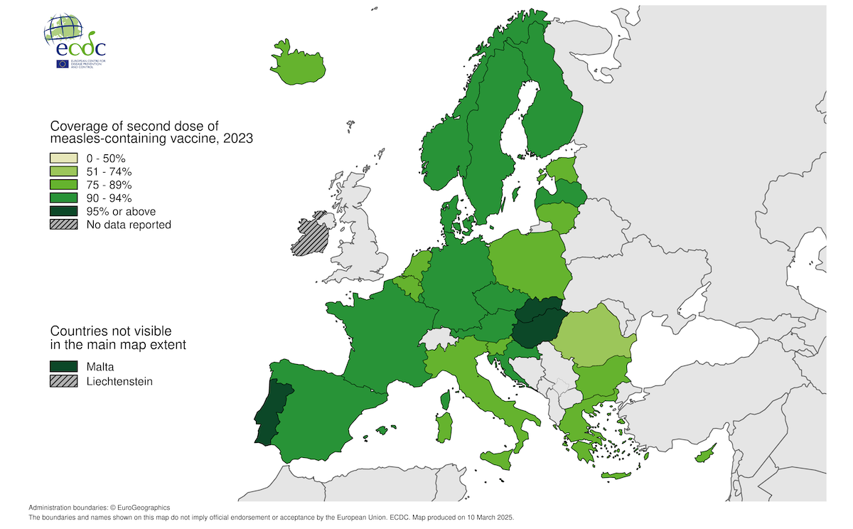 I dati del Centro europeo per la prevenzione e il controllo delle malattie (ECDC) – che a differenza dell’area valutata dall’OMS comprende solamente i 27 stati membri dell’Unione Europea più Islanda, Liechtenstein e Norvegia – confermano la grande quantità di casi nell’ultimo anno in Romania. Al secondo posto per quantità di contagi c’è l’Italia con oltre mille casi, seguita dalla Germania con circa 600 e poi da Belgio, Austria e Francia con circa 500 casi ciascuno.