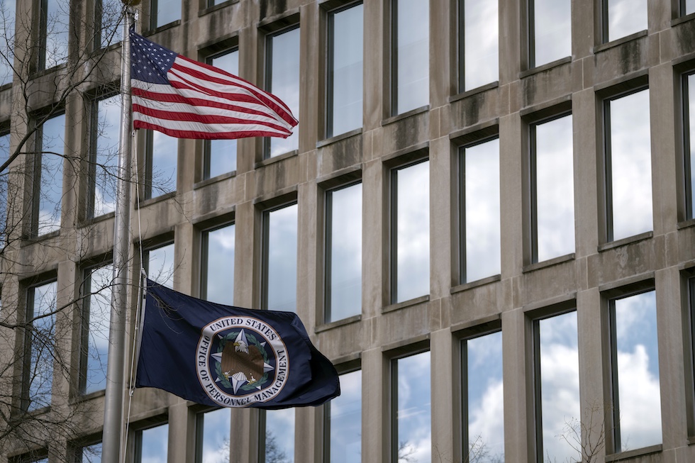 La bandiera statunitense davanti all’edificio Theodore Roosevelt, dove ha sede l’Ufficio per la gestione del personale, a Washington (AP Photo/Mark Schiefelbein)