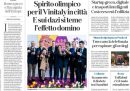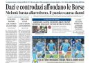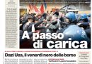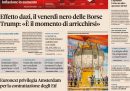 La pessima giornata della borse mondiali, e soprattutto di quella italiana, in conseguenza dell’annuncio dei dazi del presidente degli Stati Uniti Trump, le prime reazioni della presidente del Consiglio Meloni e quelle di altri paesi sono la notizia principale sulle prime pagine dei giornali di oggi. Il Manifesto titola invece sul decreto-legge “sicurezza” approvato ieri dal Consiglio dei ministri per superare le perplessità e i dissidi sul disegno di legge sullo stesso tema in discussione in parlamento da quasi un anno e mezzo, mentre il Fatto si occupa della manifestazione pacifista di oggi a Roma organizzata dal Movimento 5 Stelle.