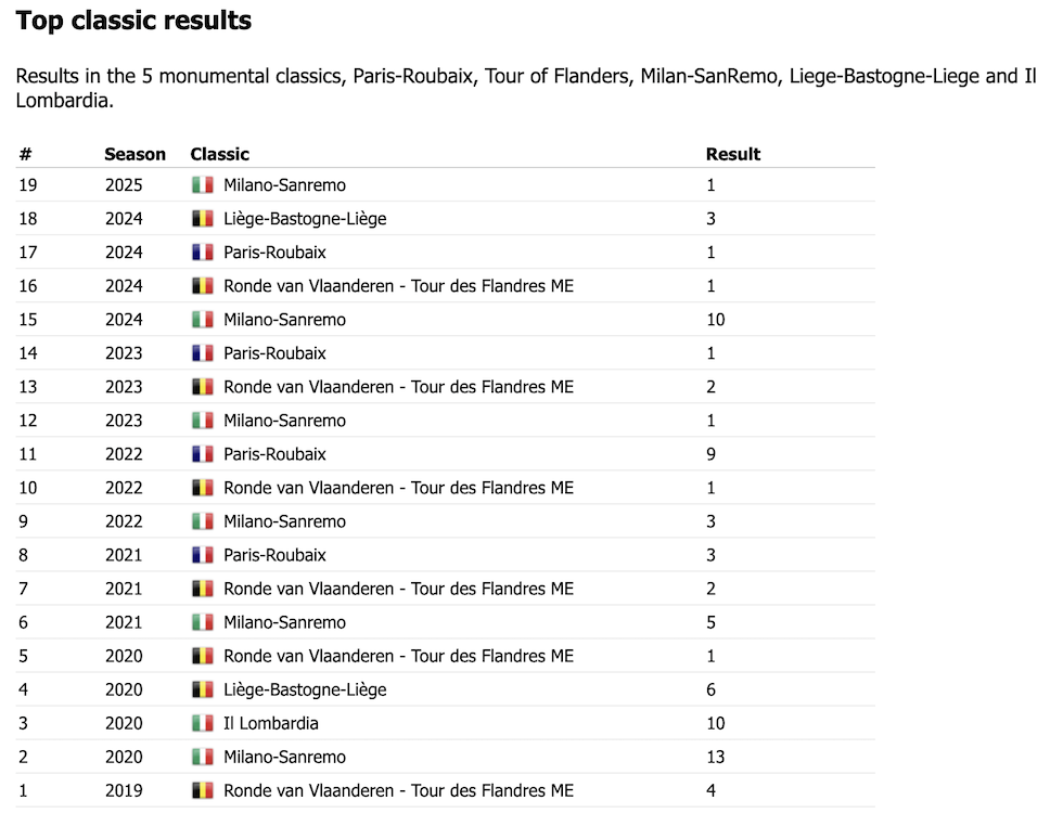 I risultati di van der Poel nelle classiche monumento: 7 vittorie e 12 podi in 19 partecipazioni, e solo una volta fuori dai primi dieci (Pro Cycling Stats)