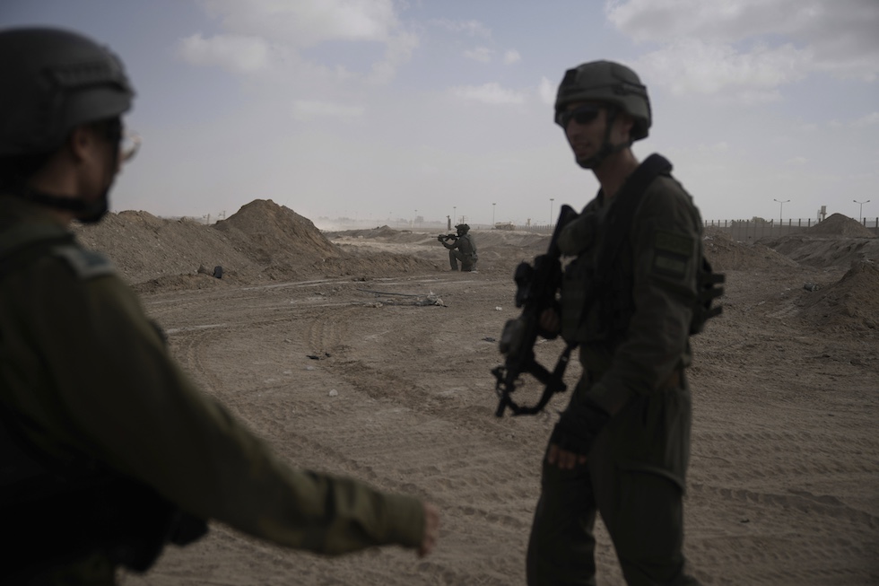 Soldati israeliani si posizionano vicino al corridoio Philadelphi, nel sud della Striscia di Gaza e vicino al confine con l’Egitto, a settembre del 2024 (AP Photo/Leo Correa)