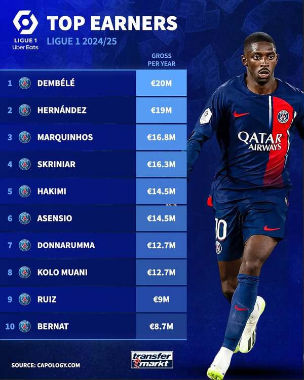 I dieci calciatori più pagati del campionato francese giocano tutti nel Paris Saint-Germain (Transfermarkt)