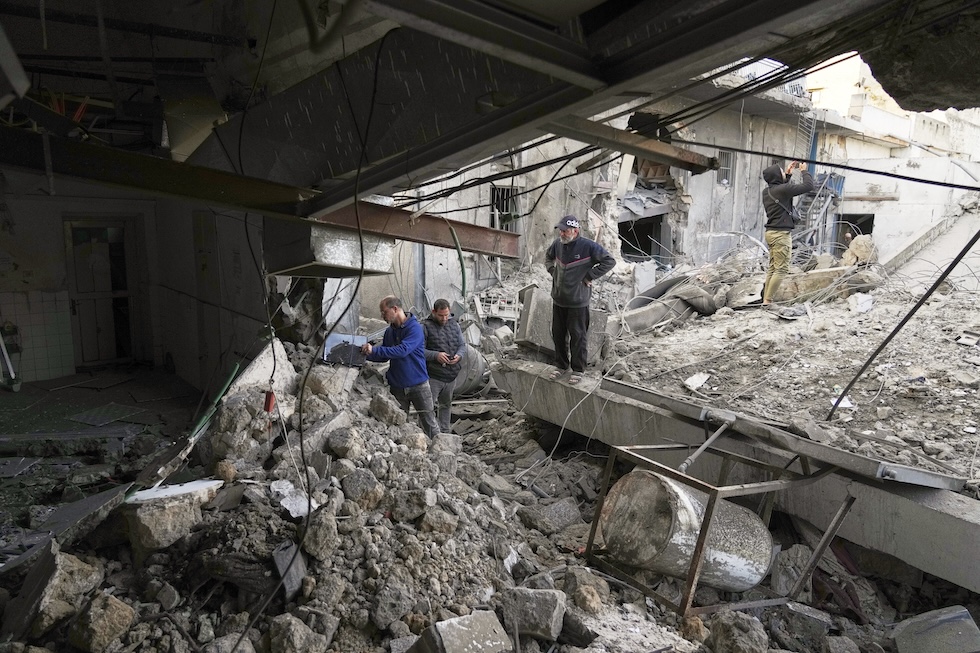 Alcune persone tra le macerie dell’ospedale distrutto, domenica 13 aprile (AP Photo/Jehad Alshrafi)
