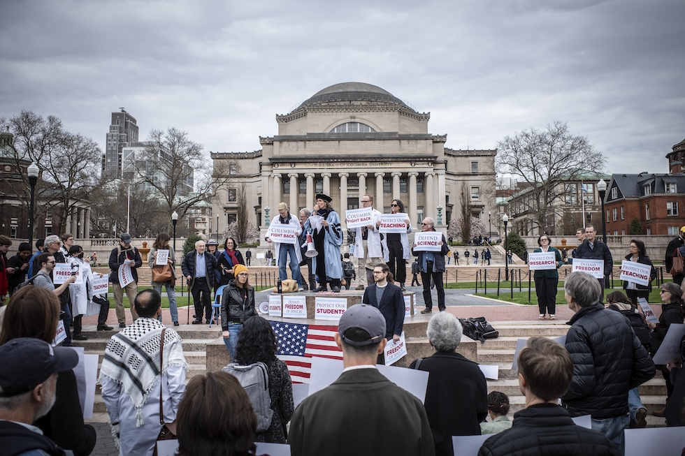 Una protesta dei docenti della Columbia contro le misure di Trump, 14 aprile (Graham Dickie/The New York Times/contrasto)