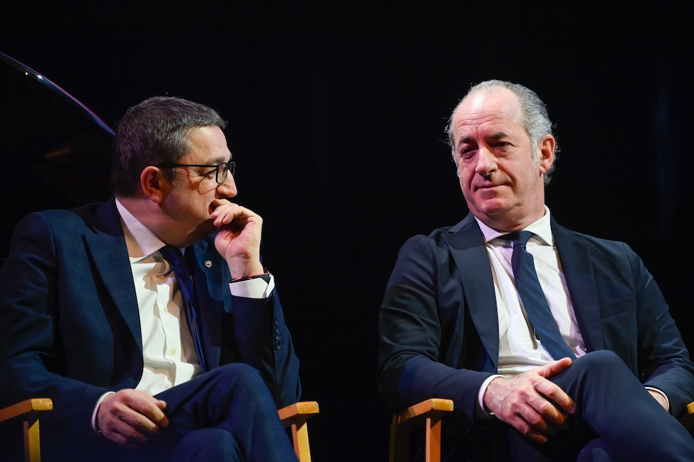 Luca Zaia e Maurizio Fugatti all’evento “One Year To Go”, a un anno dai Giochi olimpici di Milano-Cortina 2026, il 6 febbraio scorso a Milano (Claudio Furlan/Lapresse)