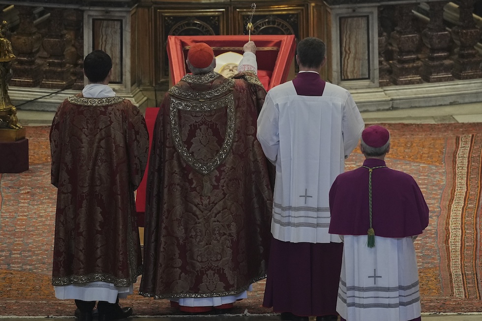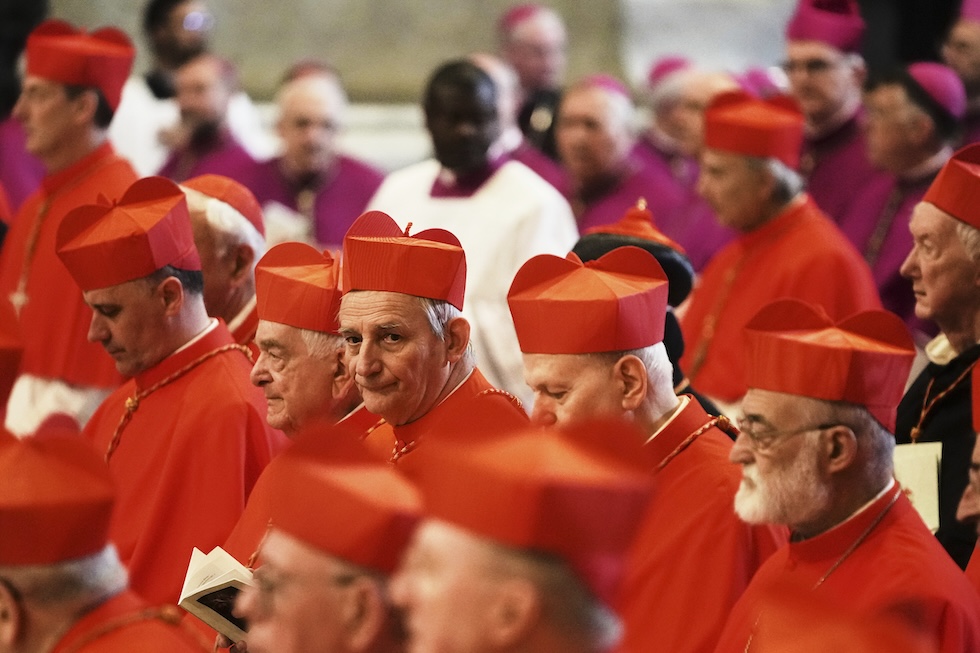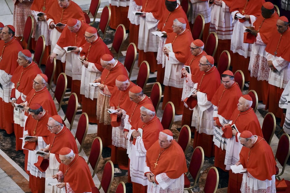 I cardinali, con la tonaca talare rossa, il rocchetto bianco, la mozzetta e lo zucchetto rossi (Alessandro Di Meo/ Pool Photo via AP)