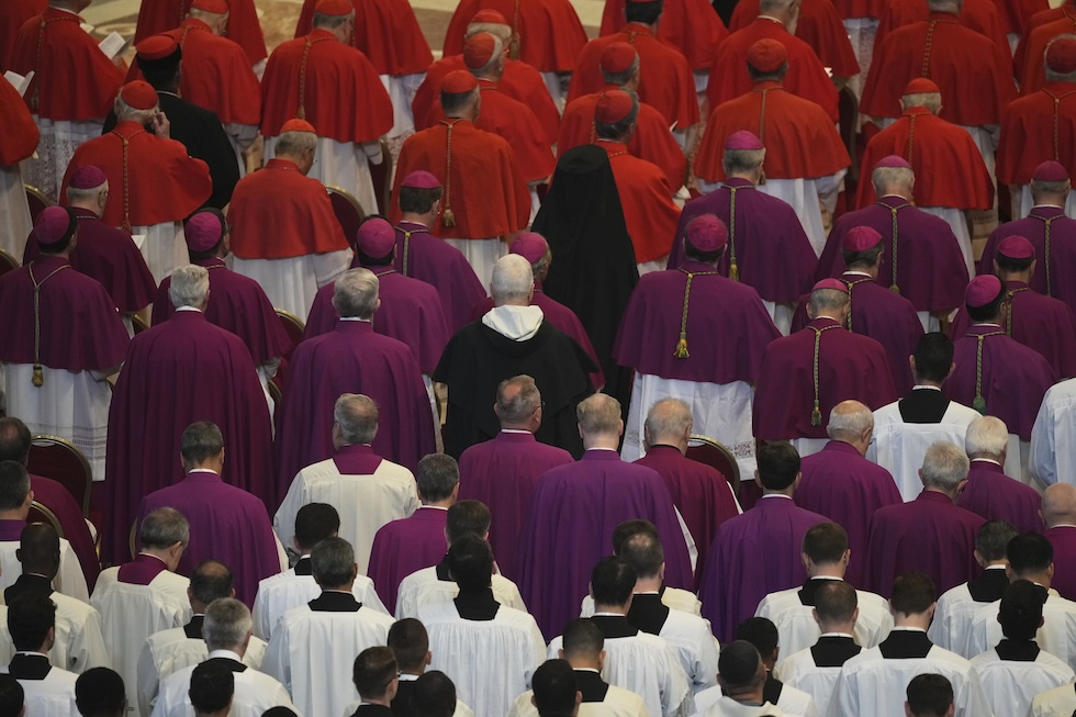 Vari tipi di abiti corali: nelle prime file cardinali, dietro i vescovi, e ancora più indietro altri sacerdoti di grado minore, che non portano la mozzetta ma la fascia (una mantella più lunga) o la cotta (la sopravveste bianca) (AP Photo/Andrew Medichini)