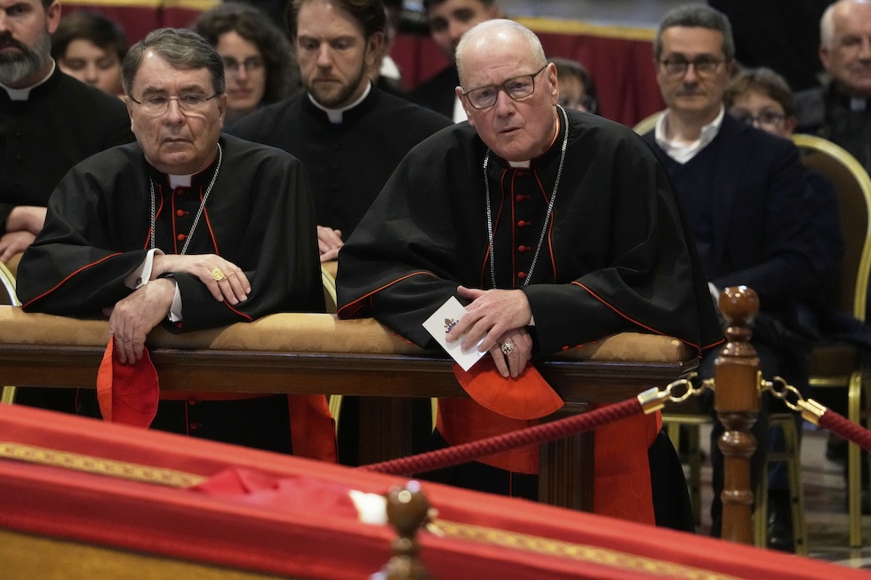 I cardinali Timothy Dolan (a destra) e Christophe Pierre con la pellegrina nera bordata di rosso, e lo zucchetto in mano (AP Photo/Gregorio Borgia)