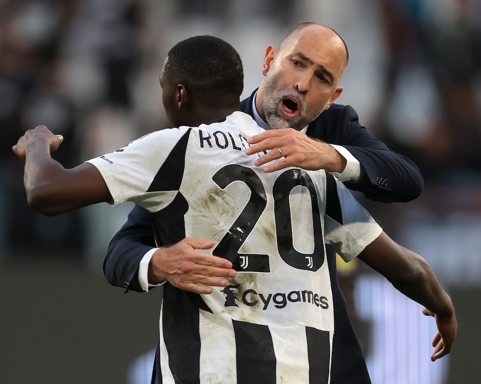 L’abbraccio tra l’allenatore della Juventus Igor Tudor e l’attaccante Randal Kolo Muani, che ha segnato nella recente vittoria contro il Monza (Jonathan Moscrop/Getty Images)