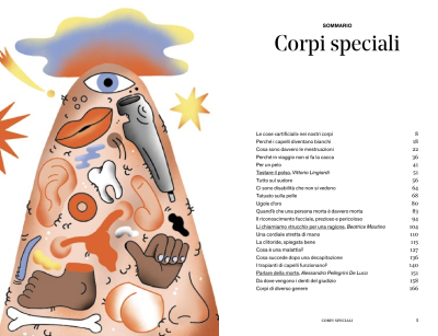 Dopo i numeri dedicati a editoria, questioni di genere, droghe, giustizia, geografia, teatro, giornali, Natale, Olimpiadi, politica degli Stati Uniti, Italia del Novecento, cibo e oggetti, in questo raccontiamo storie affascinanti, misteriose o poco conosciute sul corpo umano, che in più di un caso non erano nel libro di scienze delle superiori. Si parla ad esempio di depilazione, dei diversi modi di contare con le dita, di capelli, di sudore. E poi di protesi, mestruazioni, del bello e il brutto di andare in giro scalzi, e anche di quando è che si può dire che un corpo è morto. E altre cose che non pensiamo di chiedere o che non abbiamo mai osato chiedere.