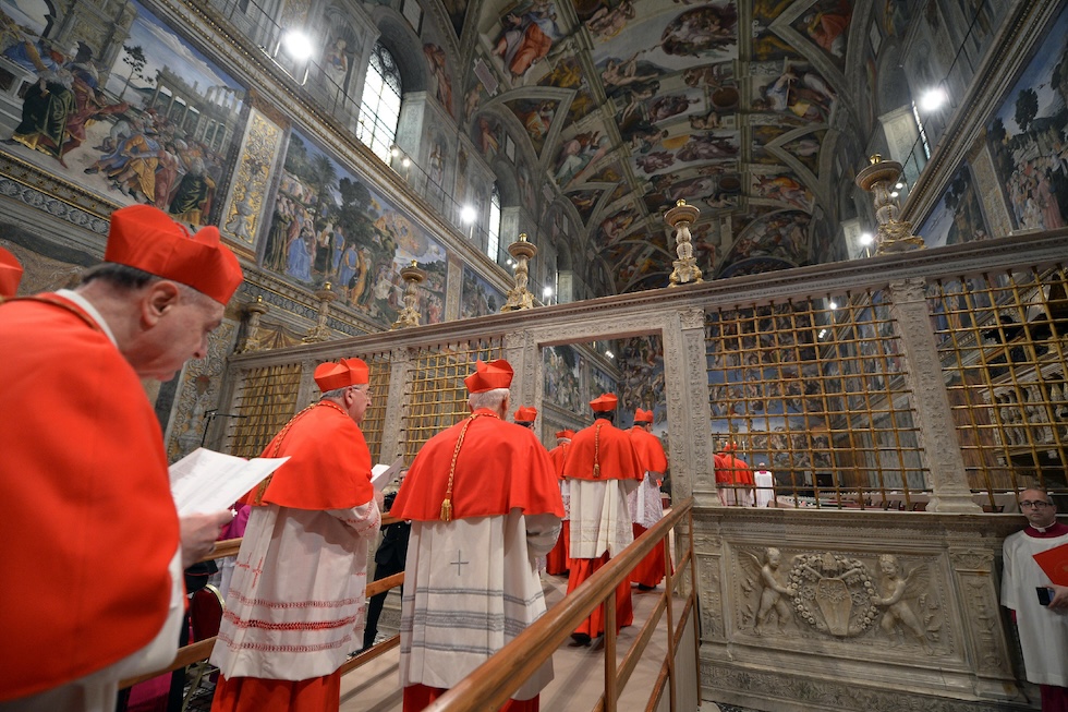 L’ingresso dei cardinali nella Cappella Sistina, nel conclave del 2013, il 12 marzo (REUTERS/Osservatore Romano)