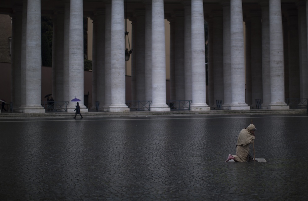 Una persona in piazza san Pietro, in Vaticano, il secondo giorno del conclave del 2013 (AP Photo/Emilio Morenatti)