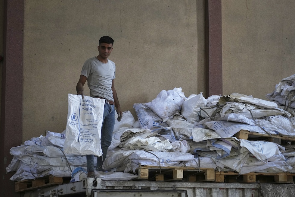 Un dipendente palestinese del WFP con sacchi vuoti per la farina (AP Photo/Abdel Kareem Hana)