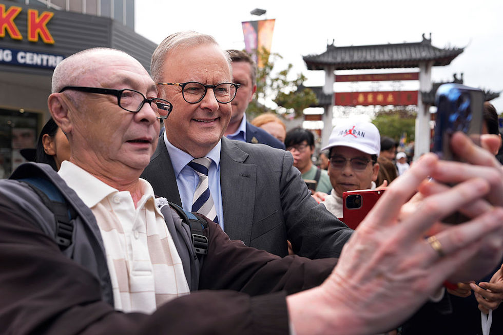 Il primo ministro australiano Anthony Albanese, a destra, e un elettore che si fa un selfie durante un evento elettorale alla periferia di Sydney (Asanka Ratnayake/Getty Images)
