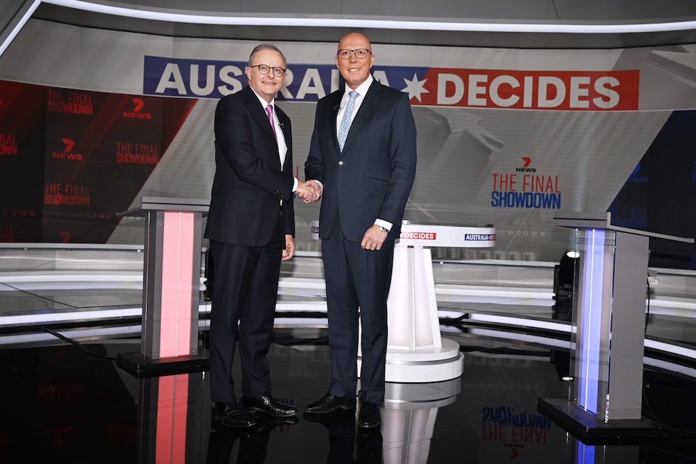 Il primo ministro australiano Anthony Albanese (a sinistra) e il leader dell’opposizione Peter Dutton durante un dibattito, il 7 aprile 2025 (Dan Peled/Getty Images)