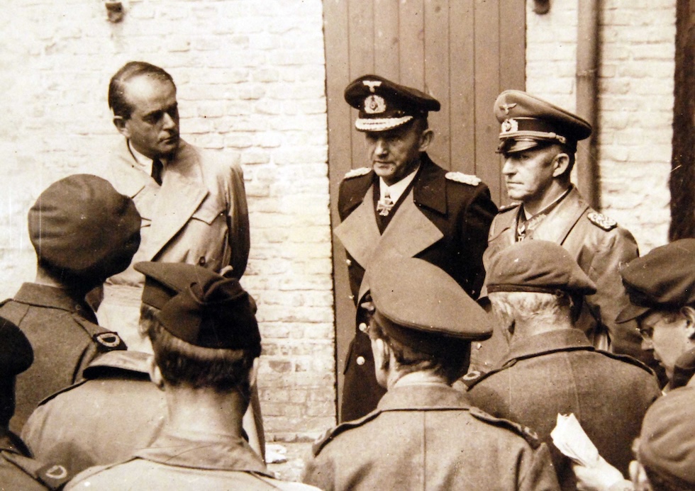 Karl Dönitz, al centro e vestito di nero, viene arrestato dai soldati alleati assieme ad altri membri del governo di Flensburg: a sinistra Albert Speer, ministro degli Armamenti, a destra il capo di stato maggiore Alfred Jodl (Wikimedia)