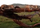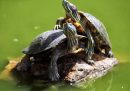 L’avvoltoio reale o avvoltoio papa (Sarcoramphus papa) è un grande uccello della famiglia dei catartidi, tipico delle foreste tropicali dell’America Latina. Ha un aspetto appariscente e molto distintivo: la testa è nuda e multicolore, ha un becco con una protuberanza arancione, il corpo bianco, le penne delle ali nere e in generale sembra piuttosto regale, o papale, come dice il nome. L’8 maggio, lo stesso giorno dell’elezione di papa Leone XIV, ne è nato uno al Bioparco di Roma. In questa raccolta trovate una foto del piccolo avvoltoio, che come potete vedere ha ancora un po’ di strada da fare per assumere le caratteristiche dell’individuo adulto. Poi ci sono un leone e una leonessa appisolati su un albero in Kenya, due tartarughe dalle orecchie rosse e una folaga che scaccia una gallinella d’acqua.