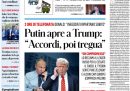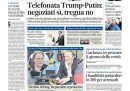 L’attesa telefonata di ieri fra il presidente degli Stati Uniti Trump e quello russo Putin è la notizia su cui aprono tutti i giornali di oggi: i titoli si dividono fra chi vede positivamente le dichiarazioni successive di Trump, che ha detto che Russia e Ucraina avvieranno immediatamente negoziati per far finire la guerra, e chi interpreta l’impegno di Putin a trattare con l’Ucraina come una tattica dilatoria che non porterà cambiamenti reali nella conduzione della guerra.