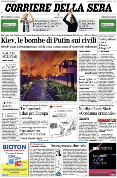 La maggior parte dei giornali di oggi si occupa in apertura della guerra fra Russia e Ucraina, con gli intensi bombardamenti russi nella notte fra sabato e domenica, l’accusa russa all’Ucraina di aver tentato di abbattere l’elicottero del presidente Putin e l’ennesima richiesta del presidente ucraino Zelensky a quello degli Stati Uniti Trump di fare pressioni sulla Russia per arrivare a una tregua. Repubblica titola sulle prese di posizione in Italia sulla situazione nella Striscia di Gaza, la Verità apre sulla trattativa fra Stati Uniti e Unione Europea sui dazi, e i giornali sportivi si occupano dei risultati dell’ultima giornata della Serie A maschile di calcio, con la qualificazione della Juventus per la prossima Champions League.