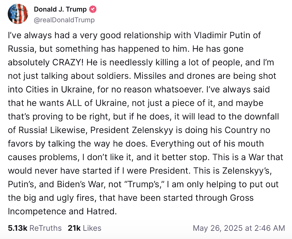 Il post di Donald Trump su Truth del 26 maggio 2025