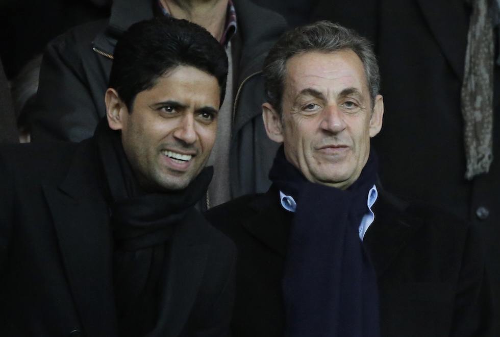 Il presidente del PSG Nasser al-Khelaifi e l’ex presidente francese Nicolas Sarkozy, tifoso della squadra, nel 2014 (AP Photo/Francois Mori)