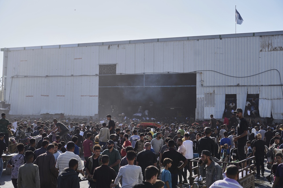 Civili palestinesi davanti a un magazzino dell’ONU nella Striscia di Gaza (AP Photo/Abdel Kareem Hana)