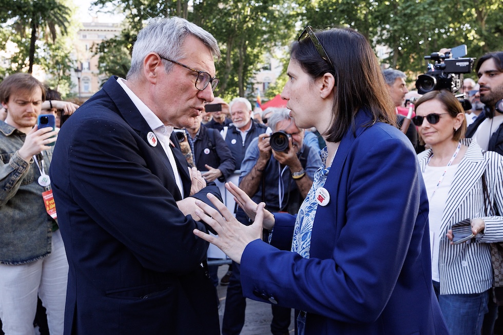 Maurizio Landini e Elly Schlein durante la maratona oratoria organizzata dalla Cgil a sostegno della partecipazione popolare ai referendum, a Roma, il 19 maggio 2025 (Roberto Monaldo/LaPresse)