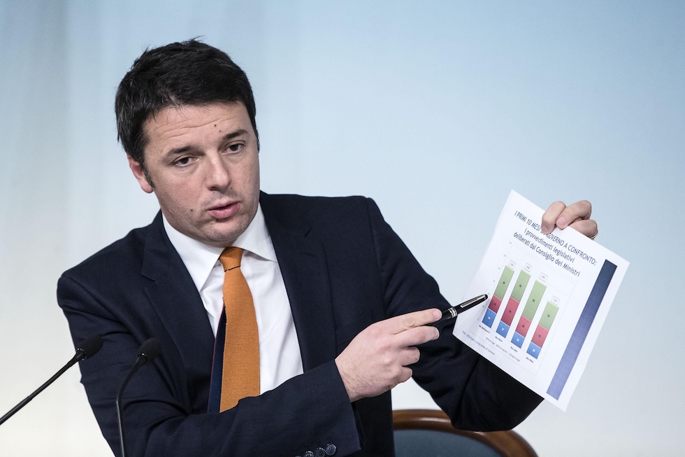 Matteo Renzi, da presidente del Consiglio, illustra il Jobs Act durante una conferenza stampa a Palazzo Chigi, il 24 dicembre 2014 (ANGELO CARCONI/ANSA)
