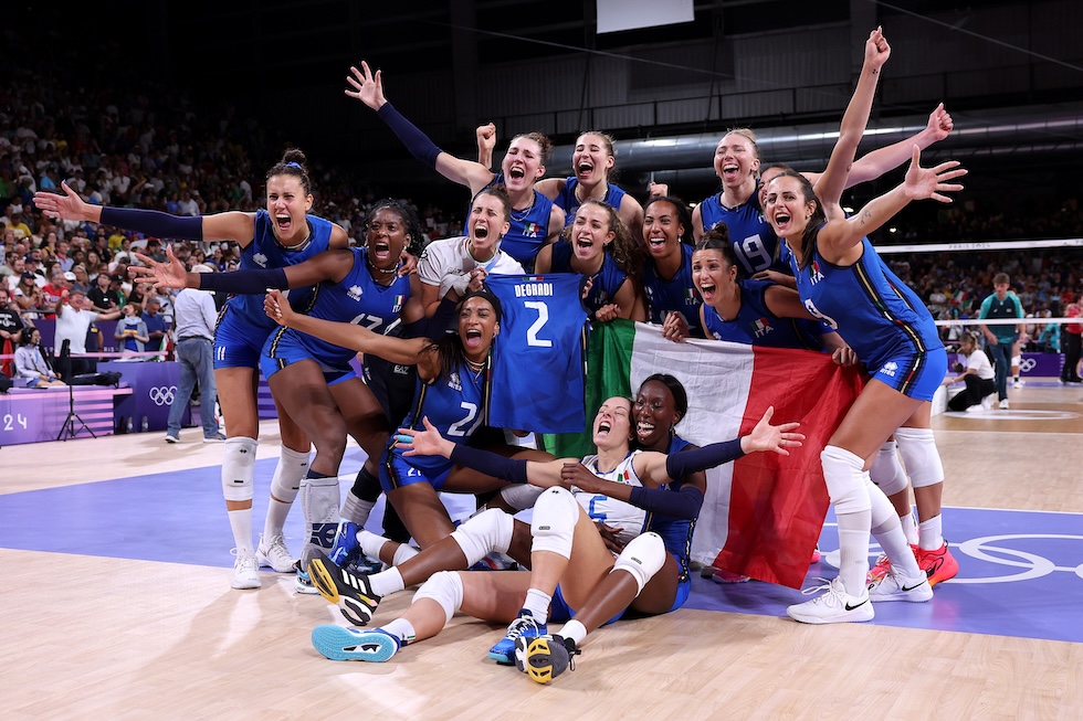 Le atlete della Nazionale festeggiano il match point nella finale olimpica a Parigi, 11 agosto 2024 (Dan Mullan/Getty Images)