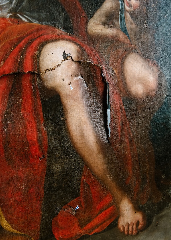 Lo strappo sul ginocchio di Ercole nel dipinto durante il restauro ai laboratori del Getty Museum di Los Angeles, 21 ottobre 2022 (Brian Guido/The New York Times via Contrasto)