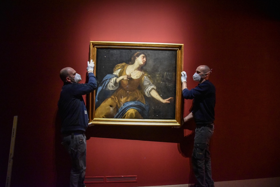 La Maddalena di Artemisia Gentileschi durante l’allestimento della mostra a Palazzo Reale a Milano, 2 marzo 2021 (Ansa/Matteo Corner)
