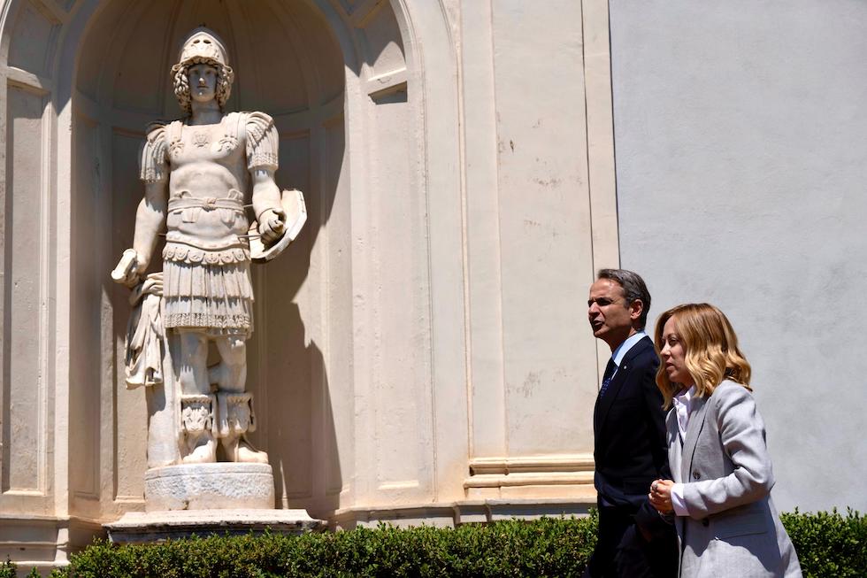 L’incontro a Villa Pamphili tra la presidente del Consiglio Giorgia Meloni e il primo ministro della Grecia Kyriakos Mitsotakis, Roma, 12 maggio 2025 (Ansa)