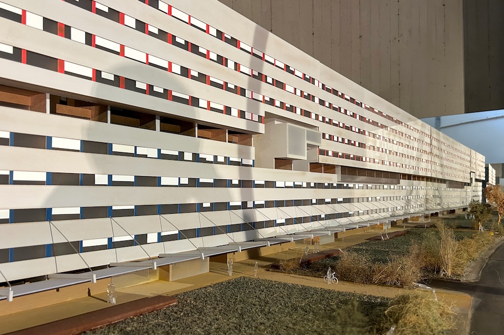 Il rendering del progetto di riqualificazione del Corviale esposto al Mitreo Iside (Angelo Mastrandrea/Il Post)