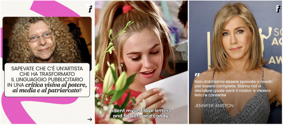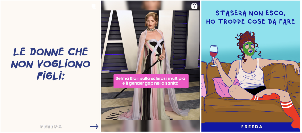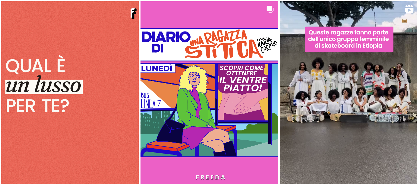 Tre contenuti sul profilo Instagram di Freeda nel giugno del 2025
