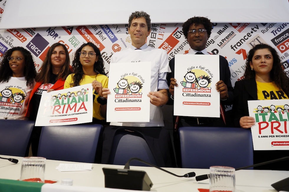 Il principale promotore del referendum, il segretario di +Europa Riccardo Magi, insieme ad alcuni membri del comitato promotore (Cecilia Fabiano / LaPresse)
