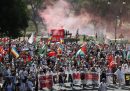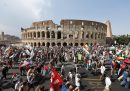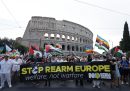Sabato pomeriggio a Roma ci sono state due manifestazioni, per certi versi simili e per altri no: a grandi linee, erano entrambe contro il riarmo e contro la guerra a Gaza. Quella più grande si chiamava “Stop Rearm Europe” («No al riarmo dell’Europa»), era stata organizzata da alcune associazioni (tra cui l’Arci) e avevano aderito poi diverse centinaia di altre tra associazioni, movimenti, sindacati. Tra i partiti aderivano Alleanza Verdi e Sinistra, Rifondazione Comunista e il Movimento 5 Stelle, il cui leader Giuseppe Conte nelle ultime settimane si era un po’ intestato la manifestazione. Il PD non aveva aderito ma alcuni esponenti del partito hanno partecipato a titolo personale, come gli europarlamentari Marco Tarquinio e Cecilia Strada e il deputato Arturo Scotto. Secondo gli organizzatori avrebbero partecipato 100mila persone, mentre per la questura solo 10mila.