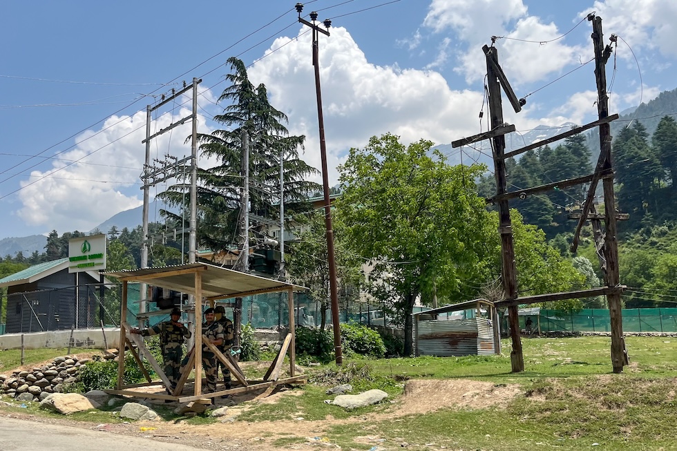 Una delle moltissime postazioni di soldati a Pahalgam, in Kashmir (Valerio Clari/il Post)