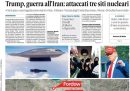L’intervento degli Stati Uniti al fianco di Israele nella guerra con l’Iran, con la decisione del presidente Trump di bombardare i tre siti nucleari iraniani di Fordo, Isfahan e Natanz, è la notizia in apertura su tutti i giornali di oggi: i temi principali sulle prime pagine sono cercare di capire quale possa essere la gravità dei danni causati dal bombardamento, le preoccupazioni per la reazione iraniana, che ha minacciato di chiudere lo stretto di Hormuz al traffico navale, e l’incontro previsto per oggi fra il ministro degli Esteri iraniano Araghchi e il presidente russo Putin.