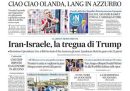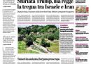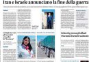 Su quasi tutti i giornali di oggi la notizia di apertura è il cessate il fuoco raggiunto fra Iran e Israele dopo dodici giorni di guerra con la mediazione del presidente degli Stati Uniti Trump, che ieri mattina ha imposto l’accordo ai due paesi. La Stampa titola invece sulla riunione dei capi di governo dei paesi della NATO iniziata ieri all’Aia, nei Paesi Bassi, e sull’aumento delle spese militari dei paesi membri richiesto da Trump, il Manifesto si occupa della gestione degli aiuti alimentari nella Striscia di Gaza da parte della organizzazione non governativa Gaza Humanitarian Foundation, mentre Libero ritiene di aprire sulla cancellazione della festa dell’Unità a Fiesole.