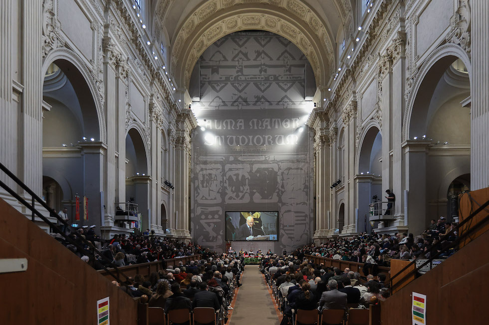 L’inaugurazione dell’anno accademico dell’università di Bologna, con il rettore Giovanni Molari e la ministra dell’Università e della Ricerca Anna Maria Bernini, il primo marzo 2025 (Guido Calamosca/LaPresse)