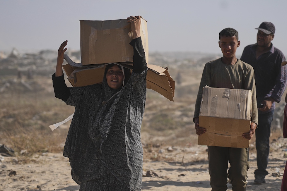 Civili palestinesi a Rafah con le scatole di cibo della Gaza Humanitarian Foundation, a fine maggio (AP Photo/Abdel Kareem Hana)