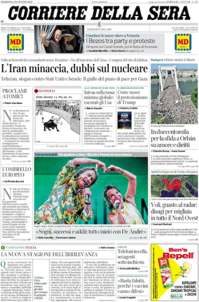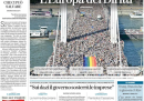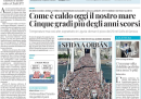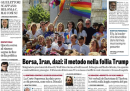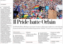 Nelle prime pagine dei principali quotidiani si trovano diverse foto del Pride di Budapest, molto partecipato nonostante il divieto imposto dal governo semi-autoritario di Viktor Orbán. Si parla anche del guasto che sabato sera ha condizionato i voli aerei civili nel Nord Italia, e del periodo di caldo piuttosto eccezionale di questi giorni. I quotidiani sportivi aprono quasi solo con le notizie sul calciomercato.