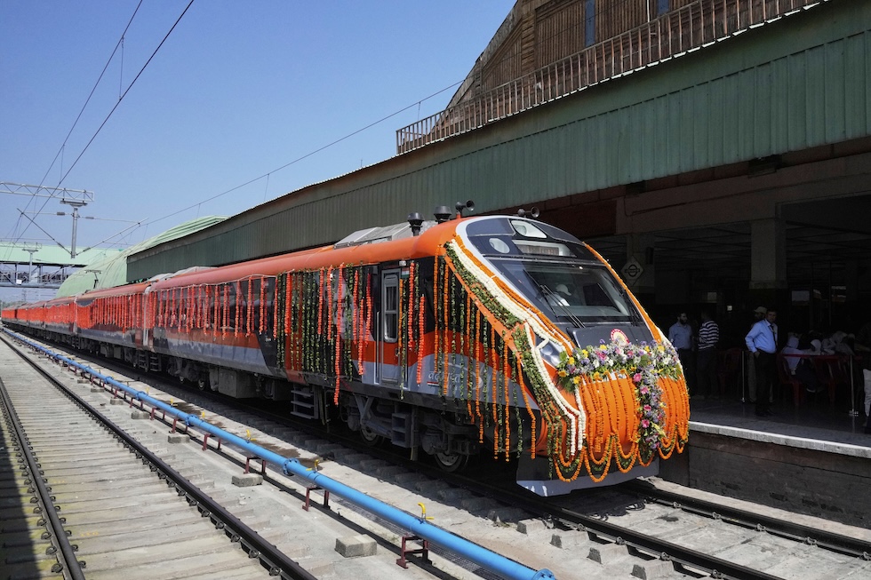 Il treno arrivato alla stazione di Srinagar dopo la corsa inaugurale (AP Photo/Dar Yasin)
