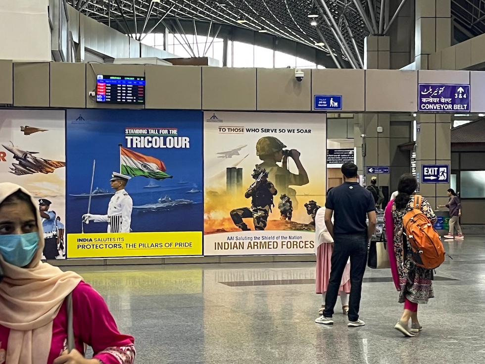 Manifesti di sostegno all’esercito indiano all’aeroporto di Srinagar (Valerio Clari/il Post)