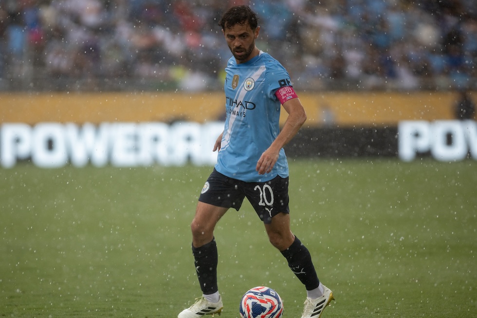 Bernardo Silva sotto la pioggia durante Manchester City-Juventus (Eston Parker/ISI Photos/ISI Photos via Getty Images)