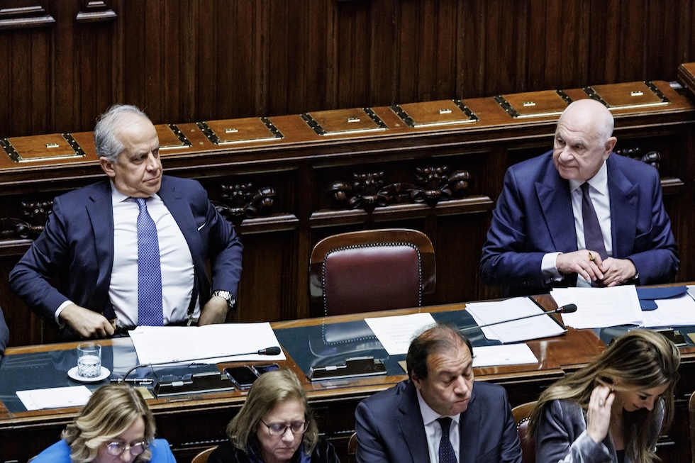 Il ministro della Giustizia Carlo Nordio e il ministro dell’Interno Matteo Piantedosi alla Camera dei deputati durante l’informativa sul caso Almasri, il 5 febbraio 2025 (Roberto Monaldo/LaPresse)