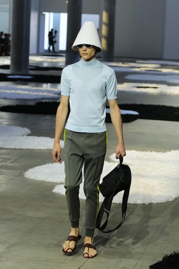 Un modello durante la sfilata di Prada a Milano, 22 giugno 2025 (AP Photo/Luca Bruno)