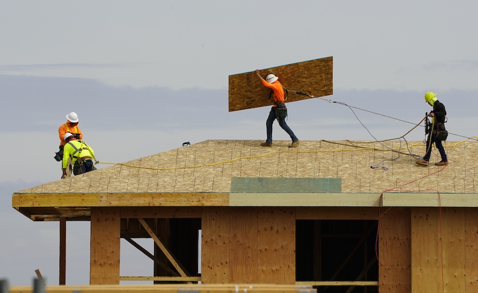 Lavori sul tetto di un edificio in costruzione a Sacramento, California, il 3 marzo 2022. (AP Photo/Rich Pedroncelli)