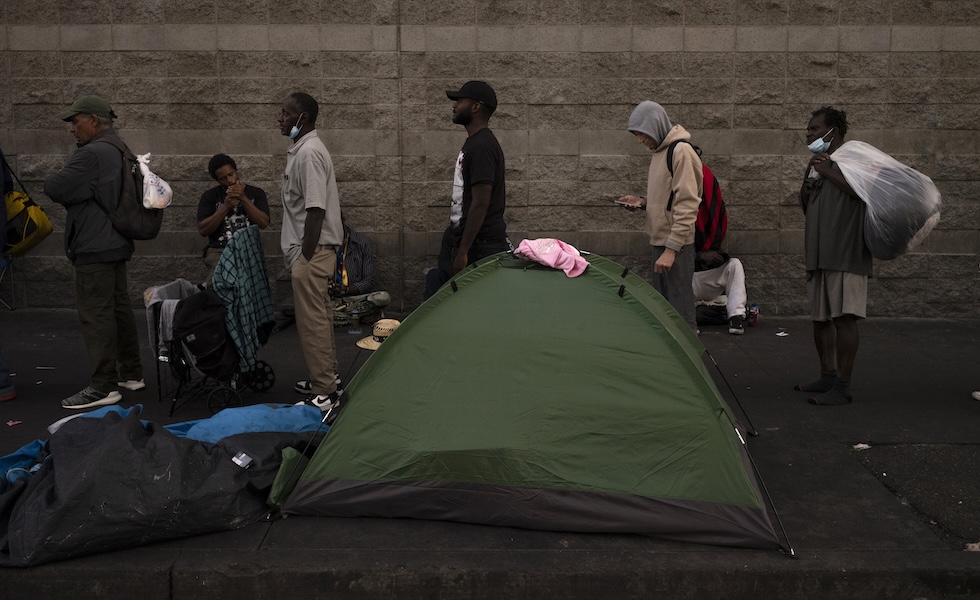 Persone senza dimora nel quartiere di Skid Row, a Los Angeles, ottobre 2023. (AP Photo/Jae C. Hong)