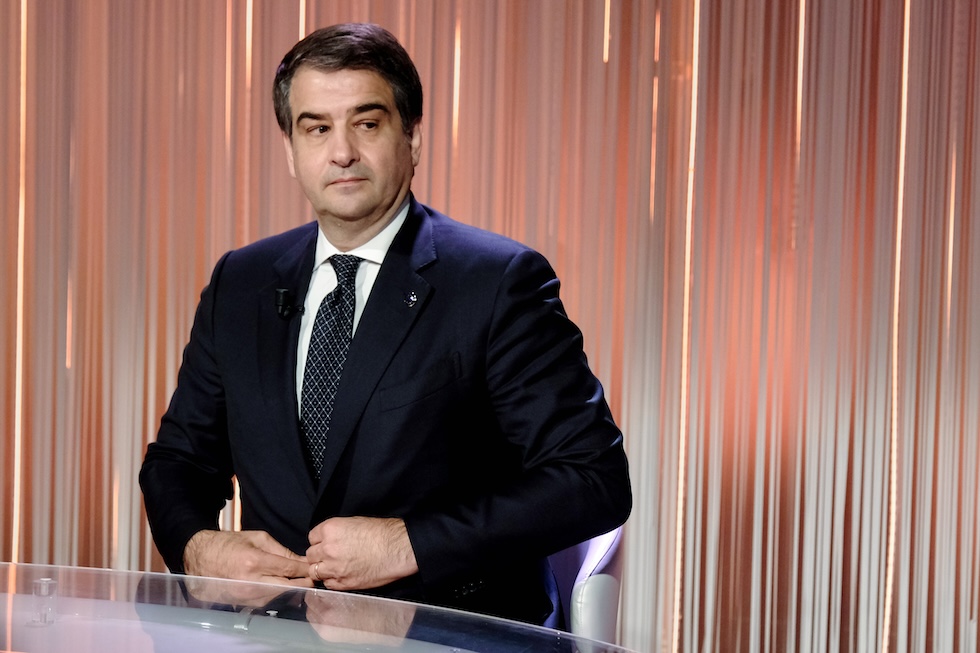 Il vicepresidente della Commissione Europea Raffaele Fitto ospite di Bruno Vespa nella trasmissione Cinque Minuti su Rai 1, il 2 aprile 2025 (Mauro Scrobogna/LaPresse)